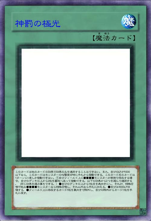 | このカードは他のカードの効果で効果のみを適用することはできない。また、自分のLPが1500以下なら、このカードはモンスターの攻撃宣言時に手札から発動できる。このカード名のカードは1ターンに1度しか発動できない。①自分フィールド上に■■■■モンスターが表側で存在する場合、自分のデッキの上から2枚を墓地へ送って発動できる。以下の効果から2つを選んで適用する。(同じ効果を選ぶ事もできる。)●自分のデッキの上から1枚目を表向きにし、それが、特殊召喚可能な■■■■モンスターなら特殊召喚し、それ以外なら手札に加える。●自分は1500LP回復する。●フィールド上に存在するカード1枚を裏向きで除外し、自分の除外からカード1枚を手札に戻す。 | |||