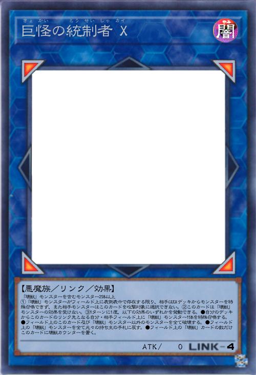 | 「壊獣」モンスターを含むモンスター2体以上 ①「壊獣」モンスターがフィールド上に表側表示で存在する限り、相手はEXデッキからモンスターを特殊召喚できず、また相手モンスターはこのカードを攻撃対象に選択できない。②このカードは「壊獣」モンスターの効果を受けない。③1ターンに1度、以下の効果のいずれかを発動できる。●自分のデッキからこのカードのリンク先となる自分・相手フィールド上に「壊獣」モンスター1体を特殊召喚する。●フィールド上のこのカード及び「壊獣」モンスター以外のモンスターを全て破壊する。●フィールド上の「壊獣」モンスターを全て元々の持ち主の手札に戻す。●フィールド上の「壊獣」カードの数だけこのカードに壊獣カウンターを置く。 | |||
