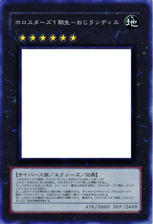 | 「ホロスターズ1期生-アルランディス」を含むレベル6モンスター×2 このカード名の(2)(3)の効果は、それぞれ1ターンに1度しか発動できない。 (1):このカードのカード名は、フィールド・墓地に存在する限り「ホロスターズ1期生-アルランディス」としても扱う。 (2):このカードのX素材を1つ取り除いて発動できる。デッキからテキストに「ホロスターズ1期生-アルランディス」と記されている魔法・罠カード1枚を手札に加える。 (3):このカードが墓地へ送られた場合に発動できる。墓地から「ホロスターズ1期生-アルランディス」1体を特殊召喚する。 | |||