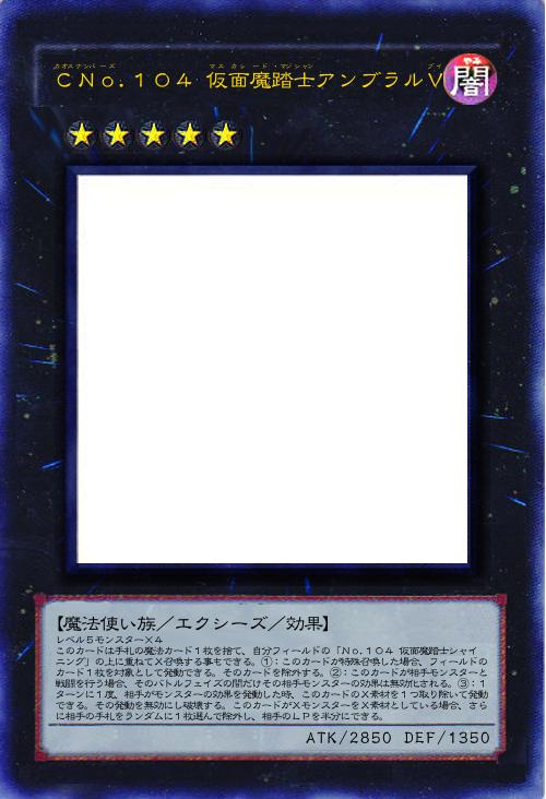 | レベル5モンスター×4 このカードは手札の魔法カード1枚を捨て、自分フィールドの「No.104 仮面魔踏士シャイニング」の上に重ねてX召喚する事もできる。①:このカードが特殊召喚した場合、フィールドのカード1枚を対象として発動できる。そのカードを除外する。②:このカードが相手モンスターと戦闘を行う場合、そのバトルフェイズの間だけその相手モンスターの効果は無効化される。③:1ターンに1度、相手がモンスターの効果を発動した時、このカードのX素材を1つ取り除いて発動できる。その発動を無効にし破壊する。このカードがXモンスターをX素材としている場合、さらに相手の手札をランダムに1枚選んで除外し、相手のLPを半分にできる。 | |||