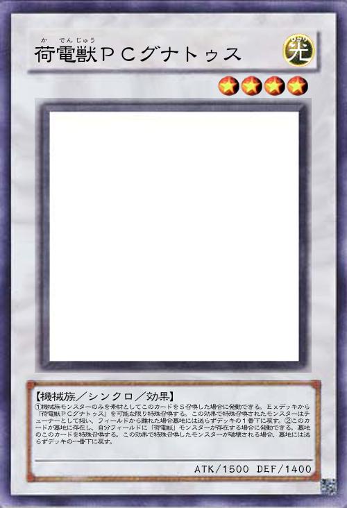 | ①このカードが機械族モンスターのみを素材としてS召喚された場合に発動できる。Exデッキから「荷電獣PCグナトゥス」を可能な限り特殊召喚する。この効果で特殊召喚されたモンスターはチューナーとして扱い、フィールドから離れた場合墓地には送らずデッキの1番下に戻す。②このカードが墓地に存在し、自分フィールドに「荷電獣」モンスターが存在する場合に発動できる。墓地のこのカードを特殊召喚する。この効果で特殊召喚したモンスターが破壊される場合、墓地には送らずデッキの一番下に戻す。 | |||