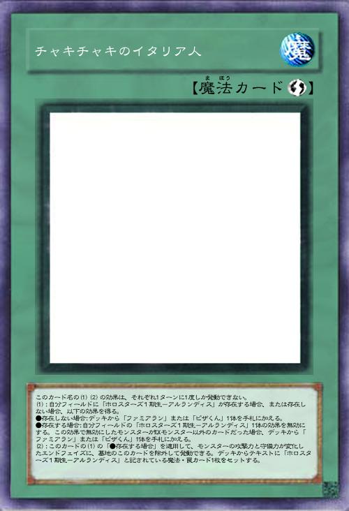 | このカード名の(1)(2)の効果は、それぞれ1ターンに1度しか発動できない。 (1):自分フィールドに「ホロスターズ1期生-アルランディス」が存在する場合、または存在しない場合、以下の効果を得る。 ●存在しない場合:デッキから「ファミアラン」または「ピザくん」1体を手札に加える。 ●存在する場合:自分フィールドの「ホロスターズ1期生-アルランディス」1体の効果を無効にする。この効果で無効にしたモンスターがEXモンスター以外のカードだった場合、デッキから「ファミアラン」または「ピザくん」1体を手札に加える。 (2):このカードの(1)の「●存在する場合」を適用して、モンスターの攻撃力と守備力が変化したエンドフェイズに、墓地のこのカードを除外して発動できる。デッキからテキストに「ホロスターズ1期生-アルランディス」と記されている魔法・罠カード1枚をセットする。 | |||