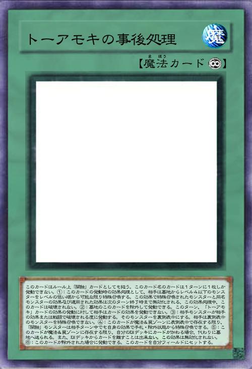 | このカードはルール上「開蝕」カードとしても扱う。このカード名のカードは1ターンに1枚しか発動できない。①:このカードの発動時の効果処理として、相手は墓地からレベル4以下のモンスターをレベルの低い順から可能な限り特殊召喚する。この効果で特殊召喚されたモンスターと同名モンスターの効果及び適用された効果は次のターン終了時まで無効化される、この効果処理中、このカードは破壊されない。②:墓地のこのカードを除外して発動できる。このターン、「トーアモキ」カードの効果の発動に対して相手はカードの効果を発動できない。③:相手モンスターが相手の効果または戦闘で破壊される度に発動する。そのモンスターを裏側表示にする。相手は裏側表示のモンスターを特殊召喚できない。④:このカードが魔法&罠ゾーンに表側表示で存在する限り、「開蝕」モンスターは相手ターン中でも自身の効果で手札・除外状態から特殊召喚できる。⑤:このカードが魔法&罠ゾーンに存在する限り、自分のEXデッキにカードが加わる場合、代わりに墓地へ送られる。また、EXデッキからカードを離すことは出来ない。この効果は無効化されない。 ⑥:このカードが除外された場合に発動できる。このカードを自分フィールドにセットする。 | |||