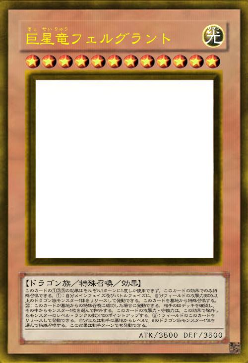 | このカードの①②③の効果はそれぞれ1ターンに1度しか使用できず、このカードの効果でのみ特殊召喚できる。①:自分メインフェイズ及びバトルフェイズに、自分フィールドの攻撃力3500以上のドラゴン族モンスター1体をリリースして発動できる。このカードを墓地から特殊召喚する。②:このカードが墓地からの特殊召喚に成功した場合に発動できる。相手のEXデッキを確認し、その中からモンスター1枚を選んで除外する。このカードの攻撃力・守備力は、この効果で除外したモンスターのレベル・ランクの数×100ポイントアップする。③:フィールドのこのカードをリリースして発動できる。自分または相手の墓地からレベル7、8のドラゴン族モンスター1体を選んで特殊召喚する。この効果は相手ターンでも発動できる。 | |||