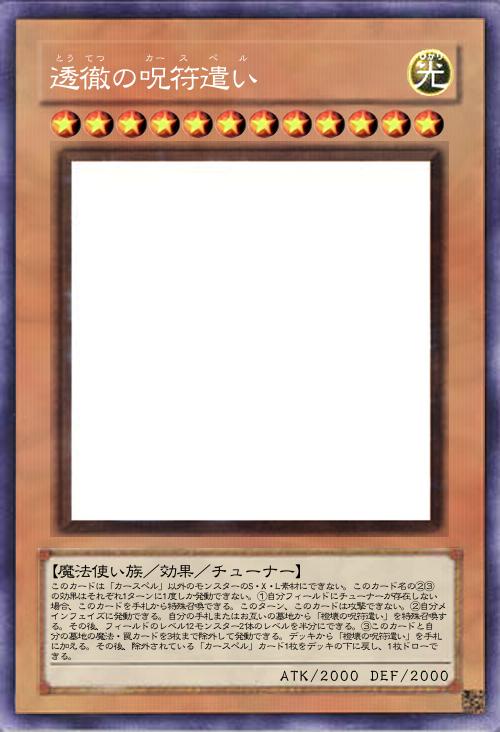 | このカードは「カースペル」以外のモンスターのS・X・L素材にできない。このカード名の②③の効果はそれぞれ1ターンに1度しか発動できない。①自分フィールドにチューナーが存在しない場合、このカードを手札から特殊召喚できる。このターン、このカードは攻撃できない。②自分メインフェイズに発動できる。自分の手札またはお互いの墓地から「橙壊の呪符遣い」を特殊召喚する。その後、フィールドのレベル12モンスター2体のレベルを半分にできる。③このカードと自分の墓地の魔法・罠カードを3枚まで除外して発動できる。デッキから「橙壊の呪符遣い」を手札に加える。その後、除外されている「カースペル」カード1枚をデッキの下に戻し、1枚ドローできる。 | |||