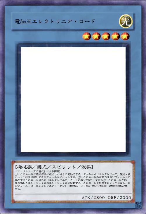 | 「エレクトリニアの儀式」により降臨。 ①:このカードが儀式召喚に成功した場合に発動できる。デッキから「エレクトリニア」魔法・罠カード1枚を選択して自分フィールドにセットする。②:このカードの攻撃力は自分フィールドに存在するこのカード以外の「エレクトリニア」カードの数×200アップする③:このカードが特殊召喚したエンドフェイズのエンドフェイズに発動する。このカードを持ち主のデッキに戻し、自分フィールドに「エレクトリニアトークン」(機械族・光・星4・攻/守1000)2体を特殊召喚する。 | |||