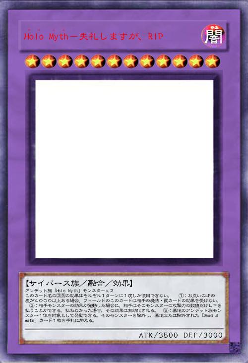 | アンデット族「Holo Myth」モンスターx2 このカード名の②③の効果はそれぞれ1ターンに1度しか使用できない。 ①:お互いのLPの差が4000以上ある場合、フィールドのこのカードは相手の魔法・罠カードの効果を受けない。 ②:相手モンスターの効果が発動した場合に、相手はそのモンスターの攻撃力の数値だけLPを払うことができる。払わなかった場合、その効果は無効化される。 ③:墓地のアンデット族モンスター1体を対象として発動できる。そのモンスターを除外し、墓地または除外された「Dead Beats」カード1枚を手札に加える。 | |||