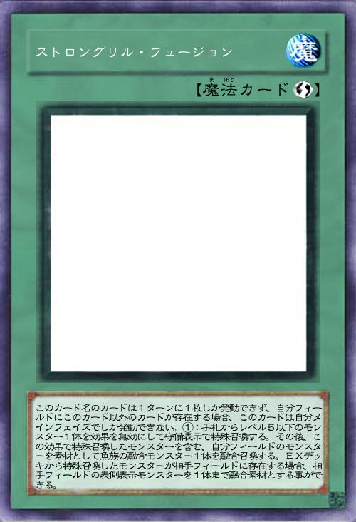 | このカード名のカードは1ターンに1枚しか発動できず、自分フィールドにこのカード以外のカードが存在する場合、このカードは自分メインフェイズでしか発動できない。①:手札からレベル5以下のモンスター1体を効果を無効にして守備表示で特殊召喚する。その後、この効果で特殊召喚したモンスターを含む、自分フィールドのモンスターを素材として魚族の融合モンスター1体を融合召喚する。EXデッキから特殊召喚したモンスターが相手フィールドに存在する場合、相手フィールドの表側表示モンスターを1体まで融合素材とする事ができる。 | |||
