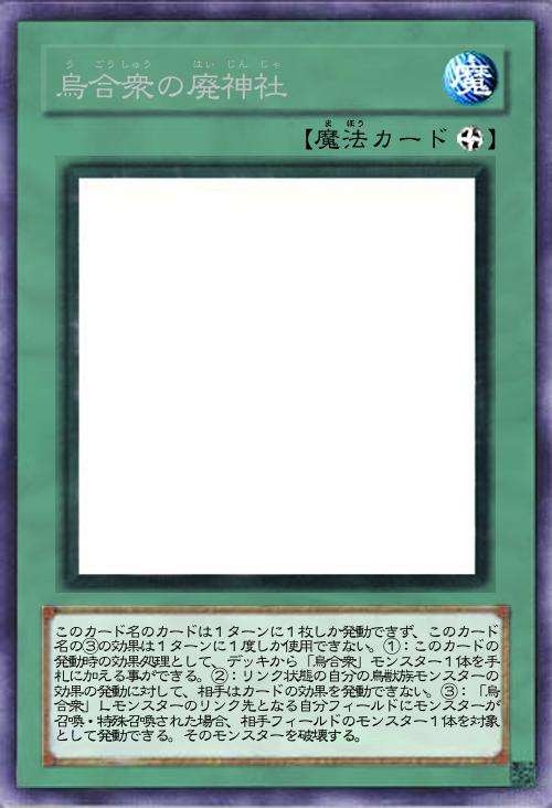 | このカード名のカードは1ターンに1枚しか発動できず、このカード名の③の効果は1ターンに1度しか使用できない。①:このカードの発動時の効果処理として、デッキから「烏合衆」モンスター1体を手札に加える事ができる。②:リンク状態の自分の鳥獣族モンスターの効果の発動に対して、相手はカードの効果を発動できない。③:「烏合衆」Lモンスターのリンク先となる自分フィールドにモンスターが召喚・特殊召喚された場合、相手フィールドのモンスター1体を対象として発動できる。そのモンスターを破壊する。 | |||