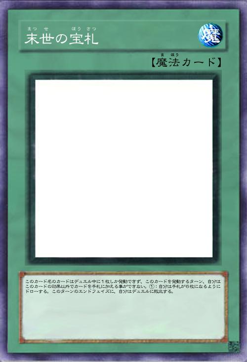 | このカード名のカードはデュエル中に1枚しか発動できず、このカードを発動するターン、自分はこのカードの効果以外でカードを手札に加える事ができない。①:自分は手札が6枚になるようにドローする。このターンのエンドフェイズに、自分はデュエルに敗北する。 | |||