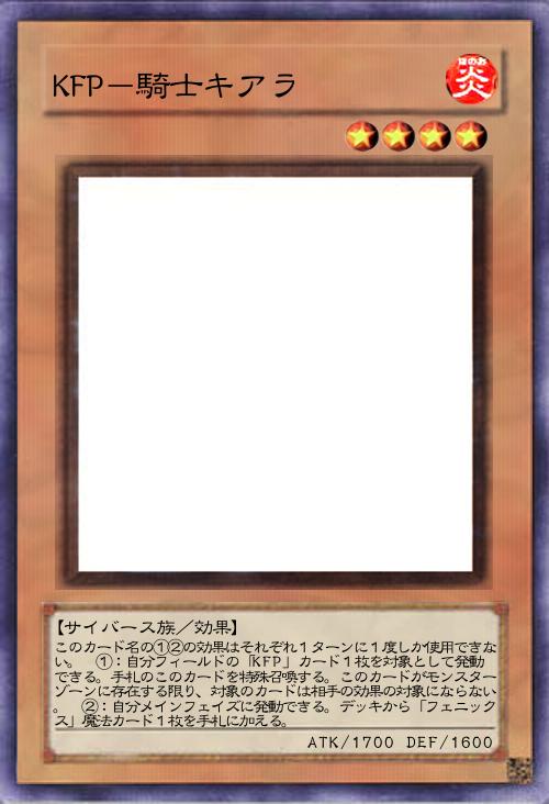 | このカード名の①②の効果はそれぞれ1ターンに1度しか使用できない。 ①:自分フィールドの「KFP」カード1枚を対象として発動できる。手札のこのカードを特殊召喚する。このカードがモンスターゾーンに存在する限り、対象のカードは相手の効果の対象にならない。 ②:自分メインフェイズに発動できる。デッキから「フェニックス」魔法カード1枚を手札に加える。 | |||