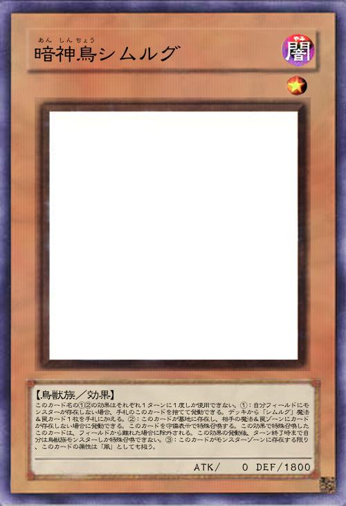 | このカード名の①②の効果はそれぞれ1ターンに1度しか使用できない。①:自分フィールドにモンスターが存在しない場合、手札のこのカードを捨てて発動できる。デッキから「シムルグ」魔法&罠カード1枚を手札に加える。②:このカードが墓地に存在し、相手の魔法&罠ゾーンにカードが存在しない場合に発動できる。このカードを守備表示で特殊召喚する。この効果で特殊召喚したこのカードは、フィールドから離れた場合に除外される。この効果の発動後、ターン終了時まで自分は鳥獣族モンスターしか特殊召喚できない。③:このカードがモンスターゾーンに存在する限り、このカードの属性は「風」としても扱う。 | |||