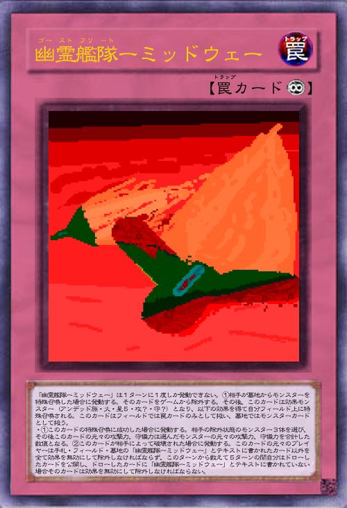 | 「幽霊艦隊ーミッドウェー」は1ターンに1度しか発動できない。①相手が墓地からモンスターを特殊召喚した場合に発動する。そのカードをゲームから除外する。その後、このカードは効果モンスター(アンデッド族・火・星5・攻?・守?)となり、以下の効果を得て自分フィールド上に特殊召喚される。このカードはフィールドでは罠カードのみとして扱い、墓地ではモンスターカードとして扱う。 ・①このカードの特殊召喚に成功した場合に発動する。相手の除外状態のモンスター3体を選び、その後このカードの元々の攻撃力、守備力は選んだモンスターの元々の攻撃力、守備力を合計した数値となる。②このカードが相手によって破壊された場合に発動する。このカードの元々のプレイヤーは手札・フィールド・墓地の「幽霊艦隊ーミッドウェー」とテキストに書かれたカード以外を全て効果を無効にして除外しなければならず、このターンから数えて5ターンの間自分はドローしたカードを公開し、ドローしたカードに「幽霊艦隊ーミッドウェー」とテキストに書かれていない場合そのカードは効果を無効にして除外しなければならない。 | |||
