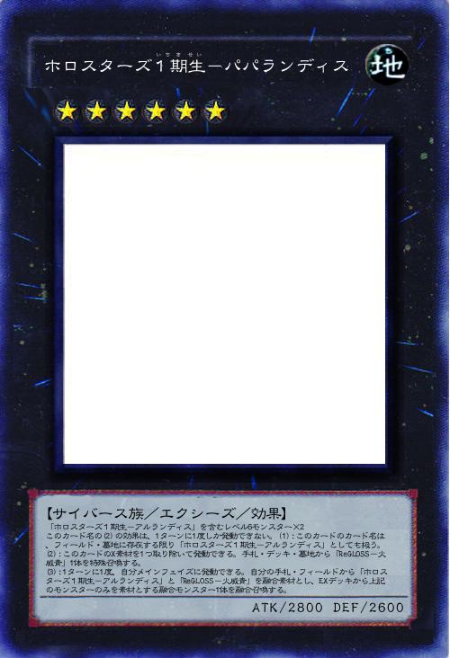 | 「ホロスターズ1期生-アルランディス」を含むレベル6モンスター×2 このカード名の(2)の効果は、1ターンに1度しか発動できない。(1):このカードのカード名は、フィールド・墓地に存在する限り「ホロスターズ1期生-アルランディス」としても扱う。 (2):このカードのX素材を1つ取り除いて発動できる。手札・デッキ・墓地から「ReGLOSS-火威青」1体を特殊召喚する。 (3):1ターンに1度、自分メインフェイズに発動できる。自分の手札・フィールドから「ホロスターズ1期生-アルランディス」と「ReGLOSS-火威青」を融合素材とし、EXデッキから上記のモンスターのみを素材とする融合モンスター1体を融合召喚する。 | |||