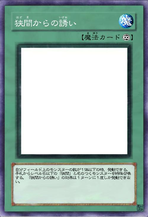 | 自分フィールド上のモンスターの数が1体以下の時、発動できる。手札からレベル6以下の「狭間」と名のつくモンスターを特殊召喚する。「狭間からの誘い」の効果は1ターンに1度しか発動できない。 | |||