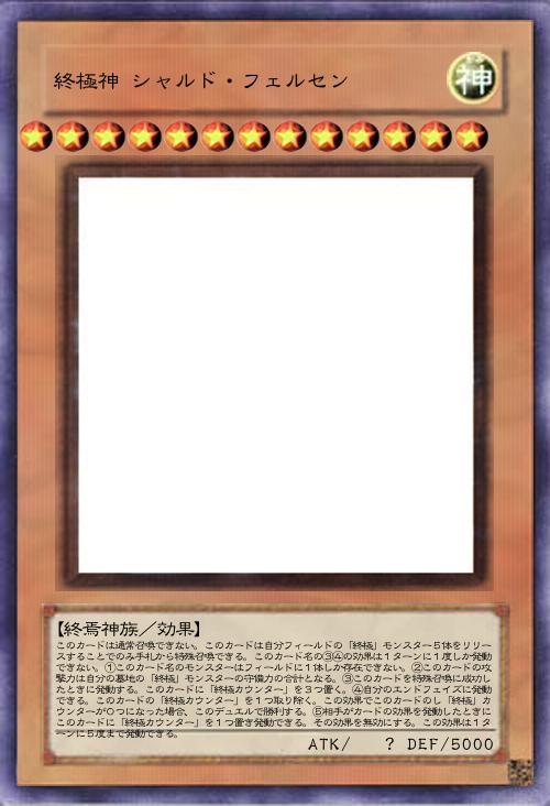 | このカードは通常召喚できない。このカードは自分フィールドの「終極」モンスター5体をリリースすることでのみ手札から特殊召喚できる。このカード名の③④の効果は1ターンに1度しか発動できない。①このカード名のモンスターはフィールドに1体しか存在できない。②このカードの攻撃力は自分の墓地の「終極」モンスターの守備力の合計となる。③このカードを特殊召喚に成功したときに発動する。このカードに「終極カウンター」を3つ置く。④自分のエンドフェイズに発動できる。このカードの「終極カウンター」を1つ取り除く。この効果でこのカードのし「終極」カウンターが0つになった場合、このデュエルで勝利する。⑤相手がカードの効果を発動したときにこのカードに「終極カウンター」を1つ置き発動できる。その効果を無効にする。この効果は1ターンに5度まで発動できる。 | |||