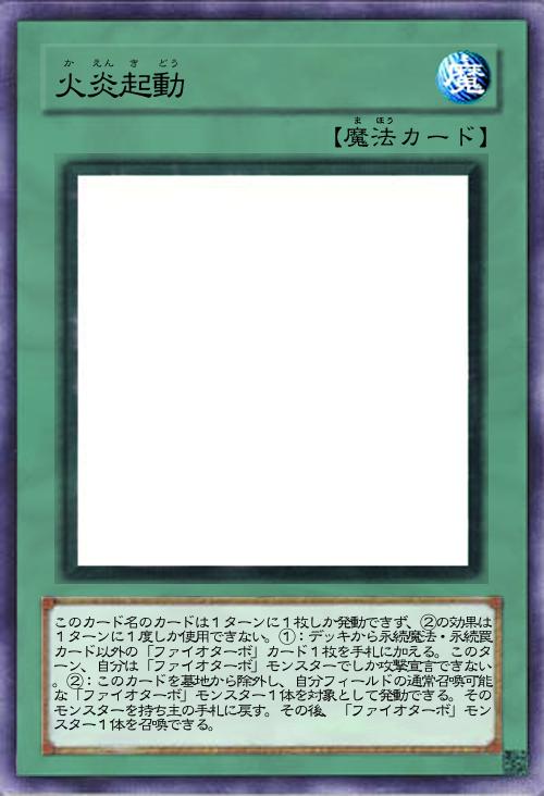 | このカード名のカードは1ターンに1枚しか発動できず、②の効果は1ターンに1度しか使用できない。①:デッキから永続魔法・永続罠カード以外の「ファイオターボ」カード1枚を手札に加える。このターン、自分は「ファイオターボ」モンスターでしか攻撃宣言できない。②:このカードを墓地から除外し、自分フィールドの通常召喚可能な「ファイオターボ」モンスター1体を対象として発動できる。そのモンスターを持ち主の手札に戻す。その後、「ファイオターボ」モンスター1体を召喚できる。 | |||