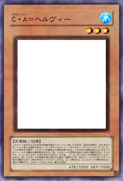 | このカード名の①による方法の特殊召喚は1ターンに1度しかできず、②③の効果は、それぞれ1ターンに1度しか使用できない。①:EXモンスターゾーンまたはフィールドゾーンに「C・A」カードが存在する場合、このカードは墓地から特殊召喚できる。この方法で特殊召喚したこのカードはフィールドを離れる場合除外される。②:このカードが召喚に成功した時に発動できる。デッキから「C・A」モンスター1体を手札に加える。その後、「C・A」モンスターの召喚を行うことが出来る。③:このカードが特殊召喚に成功した場合に発動できる。自分フィールドのモンスター1体の攻撃力はターン終了時まで1000アップする。④:L素材となったこのカードが除外された場合に発動する。このカードをデッキの1番下に戻す。 | |||