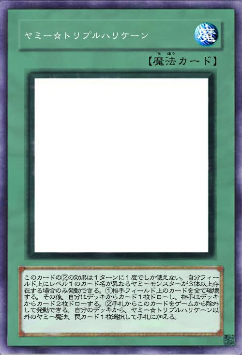 | このカードの②の効果は1ターンに1度でしか使えない。自分フィールド上にレベル1のカード名が異なるヤミーモンスターが3体以上存在する場合のみ発動できる。①相手フィールド上のカードを全て破壊する。その後、自分はデッキからカード1枚ドローし、相手はデッキからカード2枚ドローする。②手札からこのカードをゲームから除外して発動できる。自分のデッキから、ヤミー☆トリプルハリケーン以外のヤミー魔法、罠カード1枚選択して手札に加える。 | |||