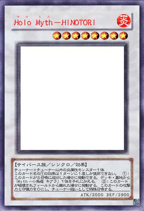 | チューナー+チューナー以外の炎属性モンスター1体 このカード名の①の効果は1ターンに1度しか使用できない。 ①:このカードがS召喚に成功した場合に発動できる。デッキ・墓地から「Myth-小鳥遊 キアラ」1体を手札に加える。 ②:このカードが破壊されフィールドから離れた場合に発動する。このカードの攻撃力と守備力を0にし、チューナー扱いとして特殊召喚する。 | |||