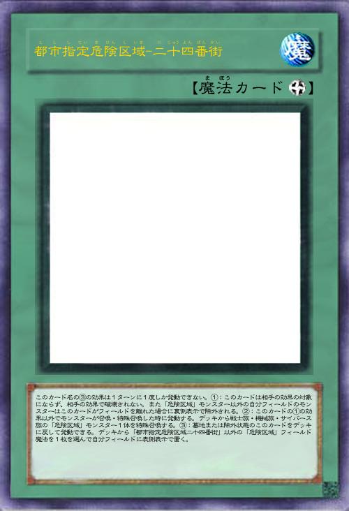 | このカード名の③の効果は1ターンに1度しか発動できない。①:このカードは相手の効果の対象にならず、相手の効果で破壊されない。また「危険区域」モンスター以外の自分フィールドのモンスターはこのカードがフィールドを離れた場合に裏側表示で除外される。②:このカードの①の効果以外でモンスターが召喚・特殊召喚した時に発動する。デッキから戦士族・機械族・サイバース族の「危険区域」モンスター1体を特殊召喚する。③:墓地または除外状態のこのカードをデッキに戻して発動できる。デッキから「都市指定危険区域二十四番街」以外の「危険区域」フィールド魔法を1枚を選んで自分フィールドに表側表示で置く。 | |||