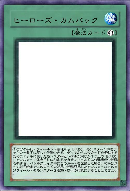 | ①自分の手札・フィールド・墓地から「HERO」モンスター1体をデッキの一番下に戻して発動できる。デッキからこのカードを発動するためにデッキに戻したモンスターとレベルが同じか1つ上の「HERO」モンスター1体を手札に加えるか自分フィールドに攻撃表示で特殊召喚する。バトルフェイズ中にこのカードを発動した場合、相手はターン終了時までこのカードの効果で特殊召喚したモンスター以外の自分フィールドのモンスターを攻撃・効果の対象にすることはできない。 | |||