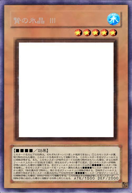 | このカード名の以下の効果は、それぞれ1ターンに1度しか使用できない。①このモンスターが裏側で除外された場合、このカードを表向きにして発動できる。このモンスターを自分フィールド上に特殊召喚する。また、このモンスターが相手のカードの効果で除外されていた場合、さらに相手フィールド上のカードを2枚まで選び、持ち主のデッキの1番下に戻す。②このモンスターが特殊召喚に成功した場合に発動できる。自分フィールド上のこのカード以外の■■■■モンスター1体を破壊し、そのモンスターとはカード名・レベル・属性の異なる■■■■モンスター2体をデッキから選び、1体を裏向きで除外し、残りを自分フィールド上に特殊召喚する。③相手フィールド上に表側で存在するモンスターの最大攻守以下の攻守を持つ■■■■モンスターが自分フィールド上に特殊召喚した場合、2000LPを払って発動できる。この効果はその特殊召喚したモンスターが特殊召喚に成功した場合に発動する効果と同じになる。 | |||