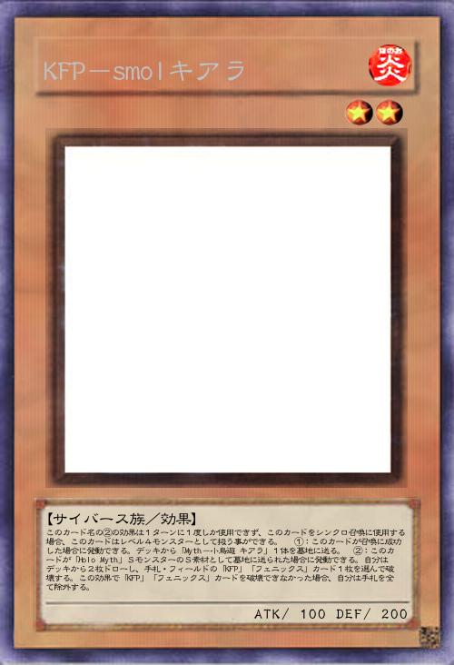 | このカード名の②の効果は1ターンに1度しか使用できず、このカードをシンクロ召喚に使用する場合、このカードはレベル4モンスターとして扱う事ができる。 ①:このカードが召喚に成功した場合に発動できる。デッキから「Myth-小鳥遊 キアラ」1体を墓地に送る。 ②:このカードが「Holo Myth」SモンスターのS素材として墓地に送られた場合に発動できる。自分はデッキから2枚ドローし、手札・フィールドの「KFP」「フェニックス」カード1枚を選んで破壊する。この効果で「KFP」「フェニックス」カードを破壊できなかった場合、自分は手札を全て除外する。 | |||