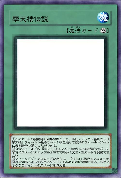 | ①このカードの発動時の効果処理として、手札・デッキ・墓地から「摩天楼」フィールド魔法カード1枚を選んで自分のフィールドゾーンに表側表示で置くことができる。 ②自分フィールドの「HERO」モンスターは効果では破壊されず、攻撃時にダメージステップ終了時まで相手は魔法・罠カードを発動できない。 ③フィールドゾーンにカードが存在し、「HERO」融合モンスターが自身の効果によって相手にダメージを与えた時に発動できる。相手に3000ポイントのダメージを与える。 | |||