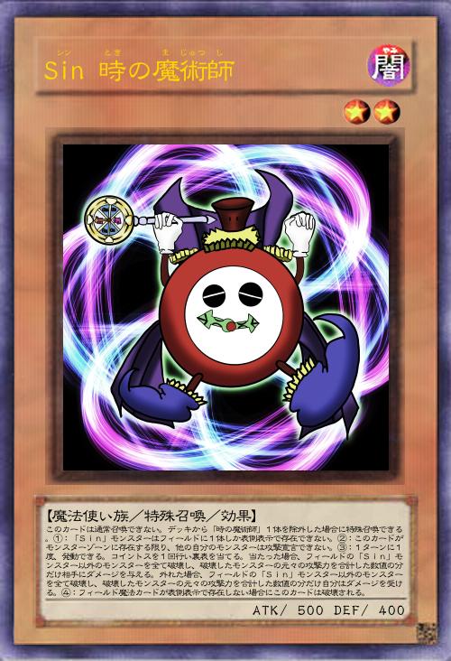 | このカードは通常召喚できない。デッキから「時の魔術師」1体を除外した場合に特殊召喚できる。①:「Sin」モンスターはフィールドに1体しか表側表示で存在できない。②:このカードがモンスターゾーンに存在する限り、他の自分のモンスターは攻撃宣言できない。③:1ターンに1度、発動できる。コイントスを1回行い裏表を当てる。当たった場合、フィールドの「Sin」モンスター以外のモンスターを全て破壊し、破壊したモンスターの元々の攻撃力を合計した数値の分だけ相手にダメージを与える。外れた場合、フィールドの「Sin」モンスター以外のモンスターを全て破壊し、破壊したモンスターの元々の攻撃力を合計した数値の分だけ自分はダメージを受ける。④:フィールド魔法カードが表側表示で存在しない場合にこのカードは破壊される。 | |||
