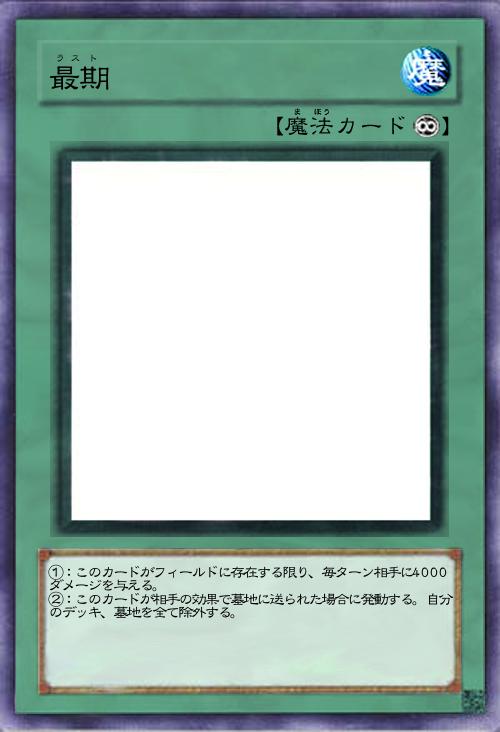 | ①:このカードがフィールドに存在する限り、毎ターン相手に4000ダメージを与える。 ②:このカードが相手の効果で墓地に送られた場合に発動する。自分のデッキ、墓地を全て除外する。 | |||