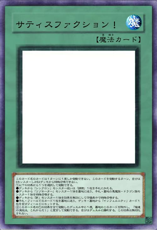 | このカード名のカードは1ターンに1度しか発動できない。このカードを発動するターン、自分はSモンスターしかEXデッキから特殊召喚できない。 ①以下の効果から1つを選択して発動できる。 ●デッキから「シンクロン」モンスター或いは「調律」1枚を手札に加える。 ●デッキから「リゾネーター」モンスター1体を墓地に送り、手札・墓地の悪魔族・ドラゴン族モンスター1体を特殊召喚する。 ●デッキから「BF」モンスター1体を効果を無効にして守備表示で特殊召喚する。 ●手札・フィールドのカード1枚を墓地に送り、デッキ・墓地から「インフェルニティ」カード1枚を自分フィールドにセットする。 ②このカード名の①の効果を全て発動したデュエル中に1度、墓地のこのカードを除外し、「俺達の満足は、これからだ!」と宣言して発動できる。自分はデュエルに勝利する。この効果は無効化されない。 | |||