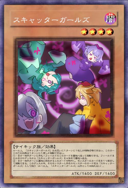 | ルール上、「スキャッターガールズ」はお互いに1ターンに1枚しか特殊召喚できない。このカードの①の効果は1ターンに1度しか発動できない。 ①:自分・相手ターンに手札・フィールドのこのカードを墓地へ送って発動できる。フィールドまたは自分のデッキから「スキャッターガールズ」を4体まで墓地へ送る。 ②:自分・相手ターンに墓地に存在するこのカードを除外し、モンスターのカード名を1つ宣言して発動できる。このデュエル中、そのモンスターと同名のモンスターのカード名は「スキャッターガールズ」として扱う(ルール上、「スキャッターガールズ」以外としては扱えない)。 | |||