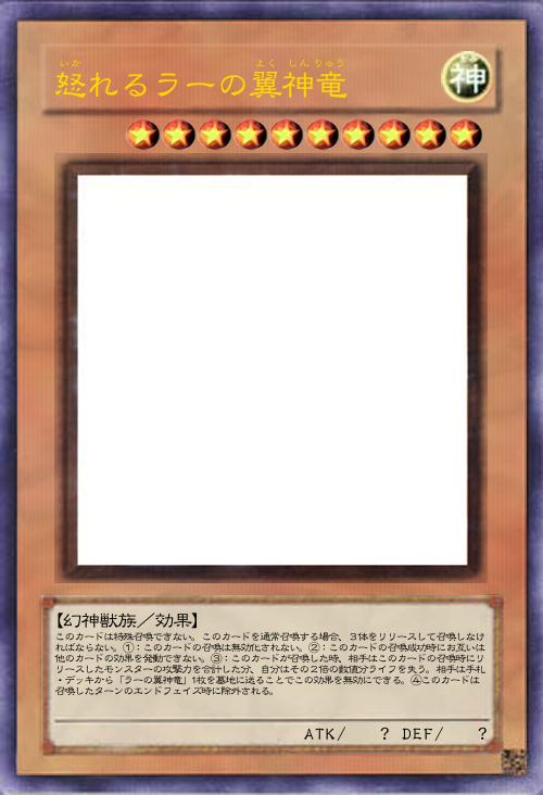 | このカードは特殊召喚できない。このカードを通常召喚する場合、3体をリリースして召喚しなければならない。①:このカードの召喚は無効化されない。②:このカードの召喚成功時にお互いは他のカードの効果を発動できない。③:このカードが召喚した時、相手はこのカードの召喚時にリリースしたモンスターの攻撃力を合計した分、自分はその2倍の数値分ライフを失う。相手は手札・デッキから「ラーの翼神竜」1枚を墓地に送ることでこの効果を無効にできる。④このカードは召喚したターンのエンドフェイズ時に除外される。 | |||