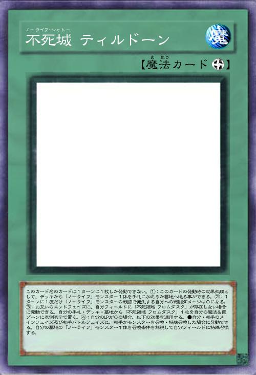 | このカード名のカードは1ターンに1枚しか発動できない。①:このカードの発動時の効果処理として、デッキから「ノーライフ」モンスター1体を手札に加えるか墓地へ送る事ができる。②:1ターンに1度だけ「ノーライフ」モンスターの戦闘で発生する自分への戦闘ダメージは0になる。③:お互いのエンドフェイズに、自分フィールドに「不死領域 フロムダスク」が存在しない場合に発動できる。自分の手札・デッキ・墓地から「不死領域 フロムダスク」1枚を自分の魔法&罠ゾーンに表側表示で置く。④:自分のLPが0の場合、以下の効果を適用する。●自分・相手のメインフェイズ及び相手バトルフェイズに、相手がモンスターを召喚・特殊召喚した場合に発動できる。自分の墓地の「ノーライフ」モンスター1体を召喚条件を無視して自分フィールドに特殊召喚する。 | |||