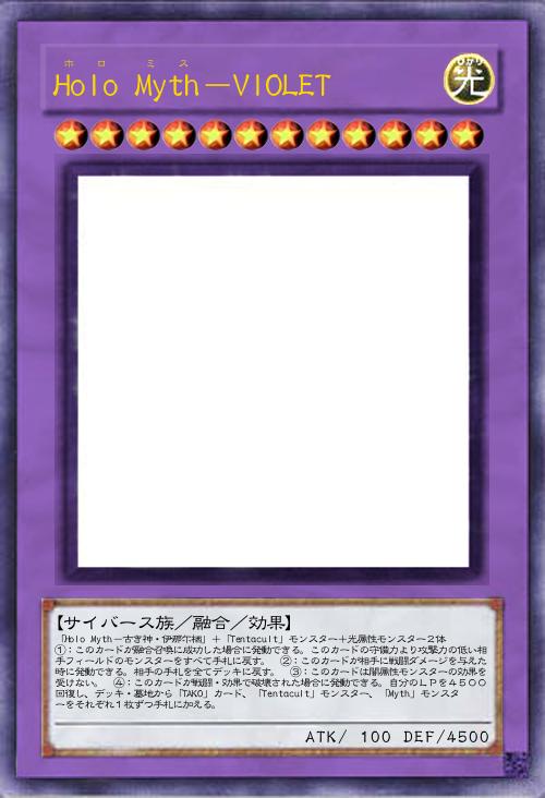 | 「Holo Myth-古き神・伊那尓栖」+「Tentacult」モンスター+光属性モンスター2体 ①:このカードが融合召喚に成功した場合に発動できる。このカードの守備力より攻撃力の低い相手フィールドのモンスターをすべて手札に戻す。 ②:このカードが相手に戦闘ダメージを与えた時に発動できる。相手の手札を全てデッキに戻す。 ③:このカードは闇属性モンスターの効果を受けない。 ④:このカードが戦闘・効果で破壊された場合に発動できる。自分のLPを4500回復し、デッキ・墓地から「TAKO」カード、「Tentacult」モンスター、「Myth」モンスターをそれぞれ1枚ずつ手札に加える。 | |||