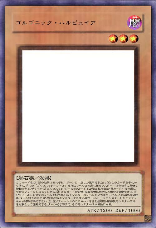 | このカード名の①③の効果はそれぞれ1ターンに1度しか使用できない。①:このカードを手札から捨て、手札の「ゴルゴニック・グール」またはレベル3の岩石族モンスター1体を相手に見せて発動できる。デッキから「ゴルゴニック・グール」のカード名が記された魔法・罠カード1枚を選んで自分フィールドにセットする。②:このカードが召喚・反転召喚に成功した場合に発動できる。自分フィールドの全てのレベルを持つ岩石族モンスターのレベルを2つまで上げる。この効果の発動後、ターン終了時まで自分は岩石族モンスターまたは水属性「No.」XモンスターしかEXデッキから特殊召喚できない。③:自分フィールドのこのカードを含む岩石族・闇属性モンスター2体を対象として発動できる。ターン終了時まで、そのモンスターは水属性になる。 | |||