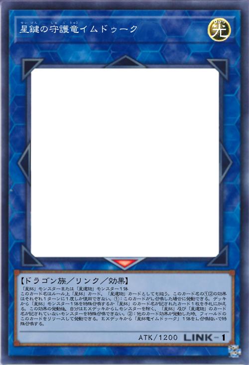 | 「星杯」モンスターまたは「星遺物」モンスター1体 このカード名はルール上「星杯」カード、「星遺物」カードとしても扱う。このカード名の①②の効果はそれぞれ1ターンに1度しか使用できない。①:このカードがL召喚した場合に発動できる。デッキから「星杯」モンスター1体を特殊召喚するか「星杯」のカード名が記されたカード1枚を手札に加える。この効果の発動後、自分はEXデッキからLモンスターを除く、「星杯」及び「星遺物」のカード名が記されていないモンスターを特殊召喚できない。②:他のカード効果が発動した時、フィールドのこのカードをリリースして発動できる。EXデッキから「星杯竜イムドゥーク」1体をL召喚扱いで特殊召喚する。 | |||