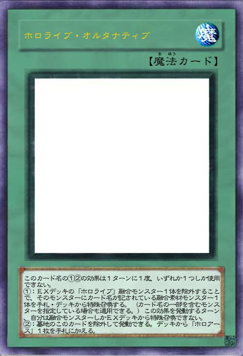 | このカード名の①②の効果は1ターンに1度、いずれか1つしか使用できない。 ①:EXデッキの「ホロライブ」融合モンスター1体を除外することで、そのモンスターにカード名が記されている融合素材モンスター1体を手札・デッキから特殊召喚する。(カード名の一部を含むモンスターを指定している場合も適用できる。)この効果を発動するターン、自分は融合モンスターしかEXデッキから特殊召喚できない。 ②:墓地のこのカードを除外して発動できる。デッキから「ホロアース」1枚を手札に加える。 | |||