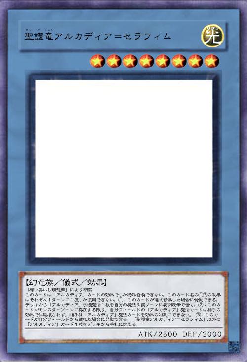 | 「願い集いし理想郷」により降臨 このカードは「アルカディア」カードの効果でしか特殊召喚できない。このカード名の①③の効果はそれぞれ1ターンに1度しか使用できない。①:このカードが儀式召喚した場合に発動できる。デッキから「アルカディア」永続魔法1枚を自分の魔法&罠ゾーンに表側表示で置く。②:このカードがモンスターゾーンに存在する限り、自分フィールドの「アルカディア」魔法カードは相手の効果では破壊されず、相手は「アルカディア」魔法カードを効果の対象にできない。 ③:このカードが自分フィールドから離れた場合に発動できる。「聖護竜アルカディア=セラフィム」以外の「アルカディア」カード1枚をデッキから手札に加える。 | |||