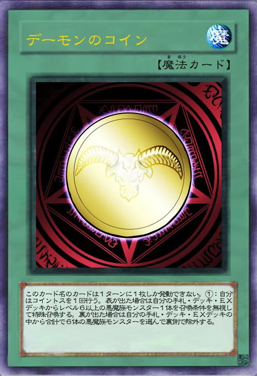 | このカード名のカードは1ターンに1枚しか発動できない。①:自分はコイントスを1回行う。表が出た場合は自分の手札・デッキ・EXデッキからレベル6以上の悪魔族モンスター1体を召喚条件を無視して特殊召喚する。裏が出た場合は自分の手札・デッキ・EXデッキの中から合計で6体の悪魔族モンスターを選んで裏側で除外する。 | |||