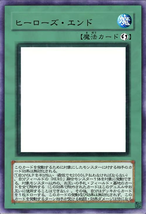 | このカードを発動するために対象にしたモンスターに対する相手のカード効果は無効化される。 ①自分のLPを半分払い(最低でも2000LP払わなければならない)、自分フィールドの「HERO」融合モンスター1体を対象に発動できる。対象モンスター以外の、お互いの手札・フィールド・墓地のカードを全て除外する(この効果で除外されたカードはこのデュエル中お互いに使用することはできない)。その後、自分はデッキからカードを1枚ドローする。このカードの発動及び効果は無効化されず、このカードを発動するターン相手が受ける戦闘・効果ダメージは倍になる。 | |||