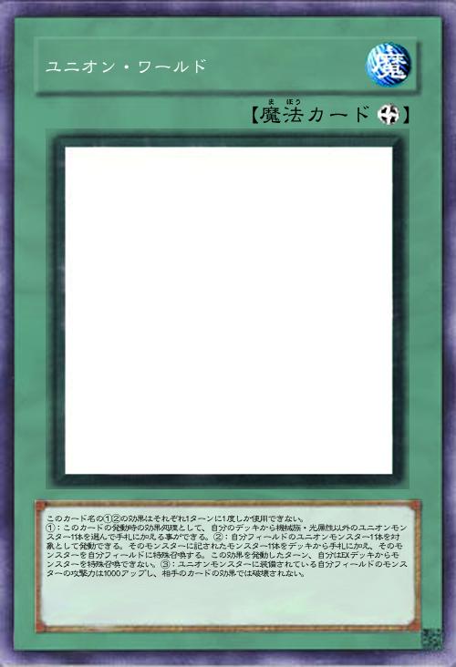 | このカード名の①②の効果はそれぞれ1ターンに1度しか使用できない。 ①:このカードの発動時の効果処理として、自分のデッキから機械族・光属性以外のユニオンモンスター1体を選んで手札に加える事ができる。②:自分フィールドのユニオンモンスター1体を対象として発動できる。そのモンスターに記されたモンスター1体をデッキから手札に加え、そのモンスターを自分フィールドに特殊召喚する。この効果を発動したターン、自分はEXデッキからモンスターを特殊召喚できない。③:ユニオンモンスターに装備されている自分フィールドのモンスターの攻撃力は1000アップし、相手のカードの効果では破壊されない。 | |||