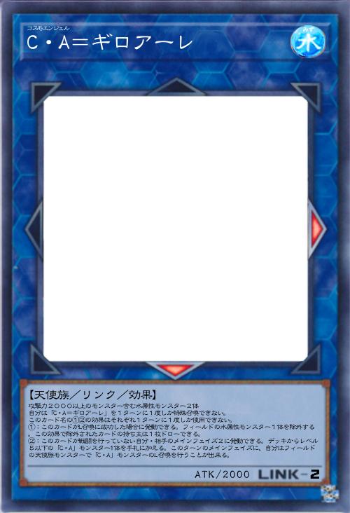 | 攻撃力2000以上のモンスター含む水属性モンスター2体 自分は「C・A=ギロアーレ」を1ターンに1度しか特殊召喚できない。 このカード名の①②の効果はそれぞれ1ターンに1度しか使用できない。 ①:このカードがL召喚に成功した場合に発動できる。フィールドの水属性モンスター1体を除外する。この効果で除外されたカードの持ち主は1枚ドローできる。 ②:このカードが戦闘を行っていない自分・相手のメインフェイズ2に発動できる。デッキからレベル5以下の「C・A」モンスター1体を手札に加える。このターンのメインフェイズに、自分はフィールドの天使族モンスターで「C・A」モンスターのL召喚を行うことが出来る。 | |||