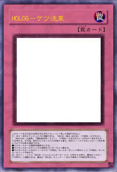 | このカード名の①②の効果はそれぞれ1ターンに1度しか使用できない。 ①:自分・相手メインフェイズに発動できる。「HOLOG-猫又 おかゆ」「0期生-ロボ子さん」「ReGLOSS-火威青」「電脳異世界-マリン」「0期生-ときのそら」いずれか1体を手札から召喚する。その後、相手のLPを1000回復する事で、相手フィールドのモンスター1体を選んで以下の効果を適用できる。 ●そのモンスターを裏側守備表示にする。 ●そのモンスターにチャンネル登録カウンターを2つ乗せる。 ●そのモンスターと自分フィールドの「0期生」モンスターをリンク素材として「0期生」モンスターをリンク召喚する。 ②:自分フィールドに「HOLOG-にゃんにゃんカーサービス」が存在する時に、墓地のこのカードを除外して発動できる。墓地の「HOLOG」チューナー1体を守備表示で特殊召喚できる。 | |||
