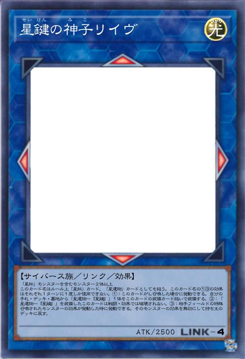 | 「星杯」モンスターを含むモンスター2体以上 このカード名はルール上「星杯」カード、「星遺物」カードとしても扱う。このカード名の①③の効果はそれぞれ1ターンに1度しか使用できない。①:このカードがL召喚した場合に発動できる。自分の手札・デッキ・墓地から「星遺物ー『星鍵』」1体をこのカードの装備カード扱いで装備する。②:「星遺物ー『星鍵』」を装備したこのカードは戦闘・効果では破壊されない。③:相手フィールドの特殊召喚されたモンスターの効果が発動した時に発動できる。そのモンスターの効果を無効にして持ち主のデッキに戻す。 | |||
