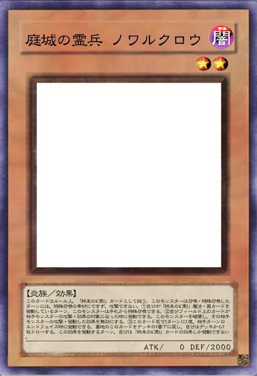 | このカードはルール上、「終末の幻影」カードとして扱う。このモンスターは召喚・特殊召喚したターンには、特殊召喚の素材にできず、攻撃できない。①自分が「終末の幻影」魔法・罠カードを発動しているターン、このモンスターは手札から特殊召喚できる。②自分フィールド上のカードが相手モンスターの攻撃・効果の対象になった時に発動できる。このモンスターを破壊し、その相手モンスターの攻撃・発動した効果を無効にする。③このカード名で1ターンに1度、相手ターンのエンドフェイズ時に発動できる。墓地のこのカードをデッキの1番下に戻し、自分はデッキから1枚ドローする。この効果を発動するターン、自分は「終末の幻影」カードの効果しか発動できない。 | |||