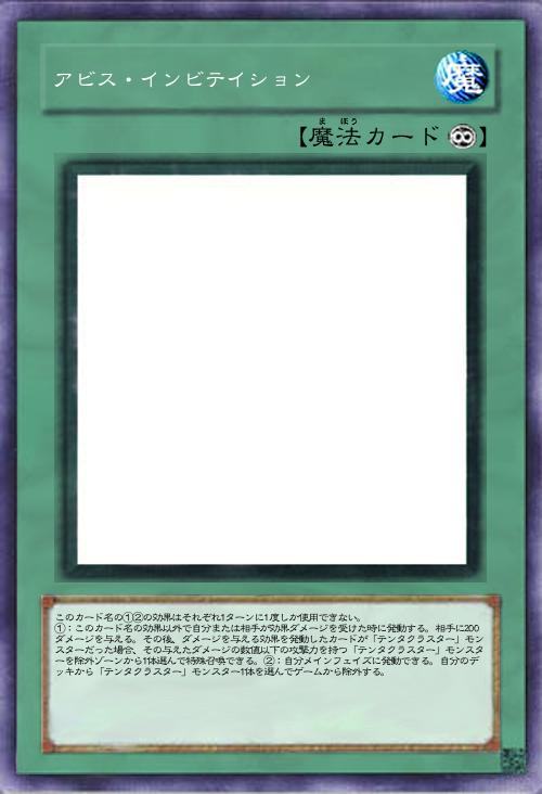 | このカード名の①②の効果はそれぞれ1ターンに1度しか使用できない。 ①:このカード名の効果以外で自分または相手が効果ダメージを受けた時に発動する。相手に200ダメージを与える。その後、ダメージを与える効果を発動したカードが「テンタクラスター」モンスターだった場合、その与えたダメージの数値以下の攻撃力を持つ「テンタクラスター」モンスターを除外ゾーンから1体選んで特殊召喚できる。②:自分メインフェイズに発動できる。自分のデッキから「テンタクラスター」モンスター1体を選んでゲームから除外する。 | |||