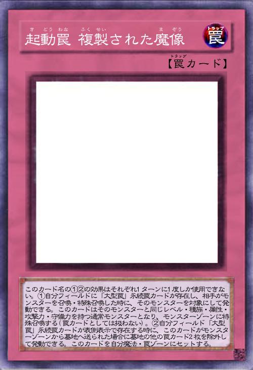| このカード名の①②の効果はそれぞれ1ターンに1度しか使用できない。①自分フィールドに「大型罠」永続罠カードが存在し、相手がモンスターを召喚・特殊召喚した時に、そのモンスターを対象にして発動できる。このカードはそのモンスターと同じレベル・種族・属性・攻撃力・守備力を持つ通常モンスターとなり、モンスターゾーンに特殊召喚する(罠カードとしては扱わない)。②自分フィールド「大型罠」永続罠カードが表側表示で存在する時に、このカードがモンスターゾーンから墓地ヘ送られた場合に墓地の他の罠カード2枚を除外して発動できる。このカードを自分魔法・罠ゾーンにセットする。 | |||