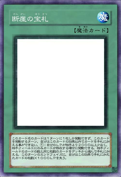 | このカード名のカードは1ターンに1枚しか発動できず、このカードを発動するターン、自分はこのカードの効果以外でカードを手札に加える事ができない。①:自分のLPが相手より2000以上少なく、相手フィールドにのみカードが存在する場合に発動できる。相手フィールドのカードの数と同じ枚数のカードをデッキから選んで手札に加える。このターンのエンドフェイズに、自分はこの効果で手札に加えたカードの枚数×1000LPを失う。 | |||